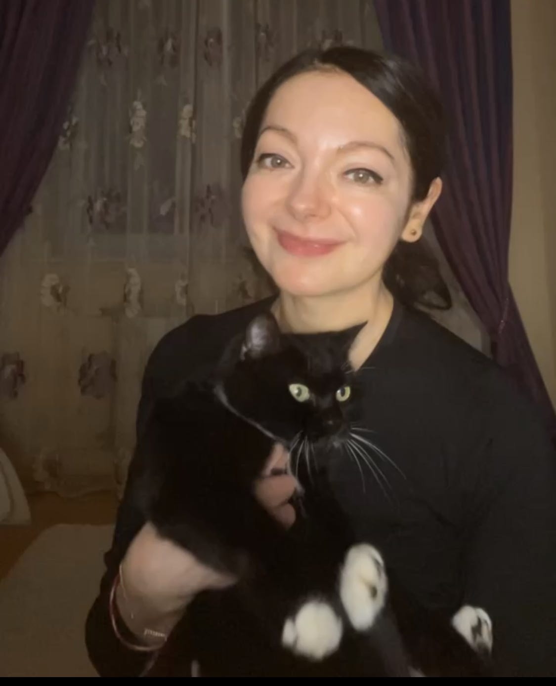 A blurry selfie taken with my cat Lola, Kyiv during black out.
